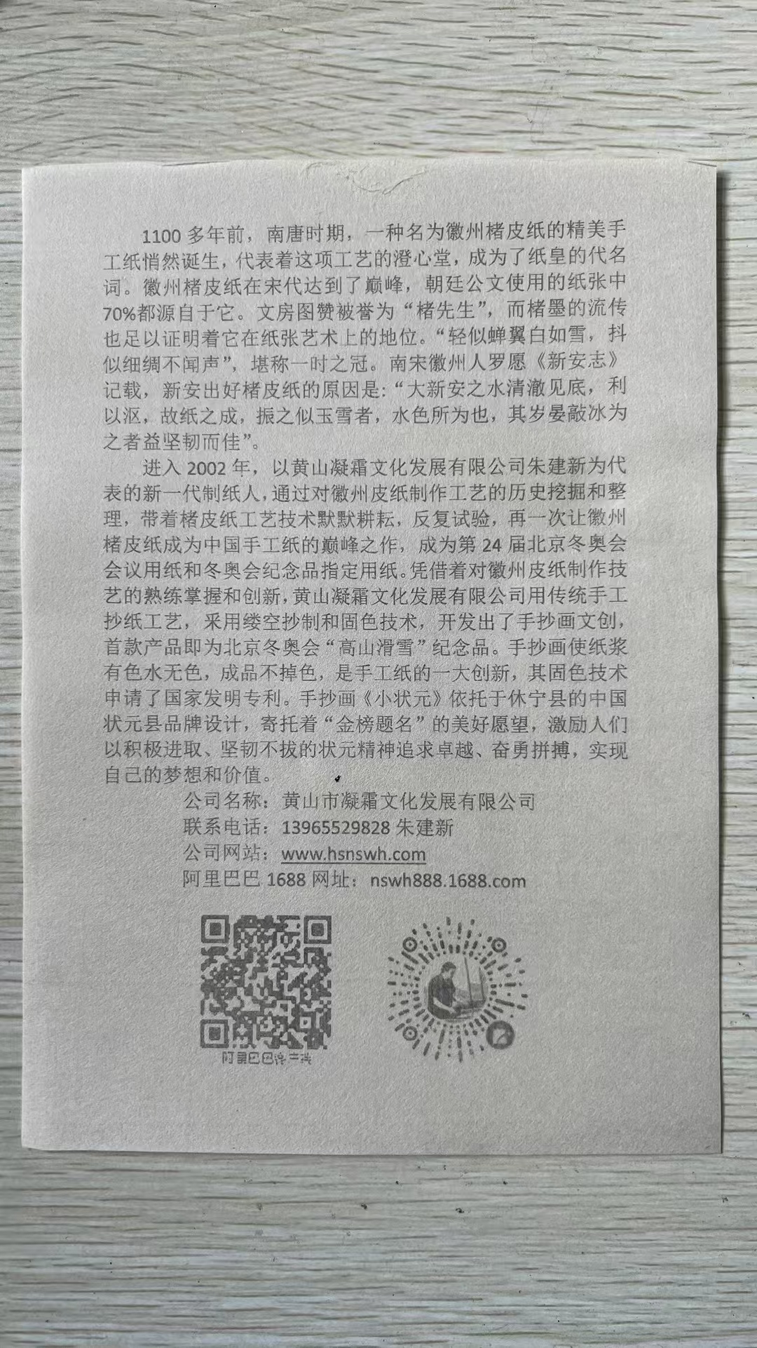 公司于2003年在休寧縣海陽(yáng)鎮(zhèn)恢復(fù)徽州皮紙傳統(tǒng)工藝生產(chǎn),2018年因城市改造搬遷,投入資金700萬(wàn)元,建成了手工紙研學(xué)體驗(yàn)館,楮皮紙制作技藝傳承館,歷史文化展示館,黟川雪紙行和古法徽州皮紙制作技藝館。并于2018年被錄入中國(guó)手工紙文庫(kù),2019年被批準(zhǔn)為市級(jí)非遺項(xiàng)目保護(hù)單位,2022年獲得省級(jí)非物質(zhì)文化遺產(chǎn)項(xiàng)目授牌。